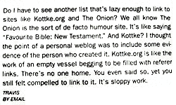 Near the end of the article, he even laments that what’s missing are “blogs dedicated to cultural pursuits written with the same enthusiastic, hobbyhorse zeal as the breaking-news blogs”. The funny thing is that if you break the habit of only reading the sites listed in Instapundit’s sidebar, you’ll find that there are *tons* of weblogs out there doing just that. Granted, many of them are about technology and Web design, but there are more and more on music and movies and television and theatre and cars and sewing and parenting and cooking and eating and and and! And the majority of weblogs aren’t even focused at all…they just talk about whatever strikes their fancy. A more interesting point to make here is how weblogs on specific topics are hard to find unless the weblogs writer is already some sort of known journalist (i.e. the network is huge and therefore valuable, but it’s largely useless without tools to get people to the information they are looking for).