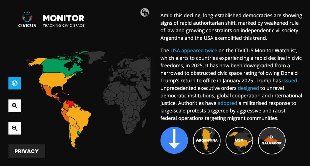 Civicus monitors the health of civic societies and their freedoms around the world. In their annual assessment on civic freedoms for 2025, they downgraded the United States from “narrowed” to “obstructed”.