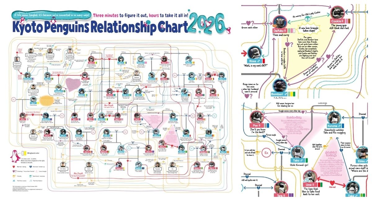 Two Japanese aquariums have released their 2026 flowcharts of their penguins’ relationships. “Penguin drama can include serious crushes and heartbreaks but also adultery and egg-stealing.”