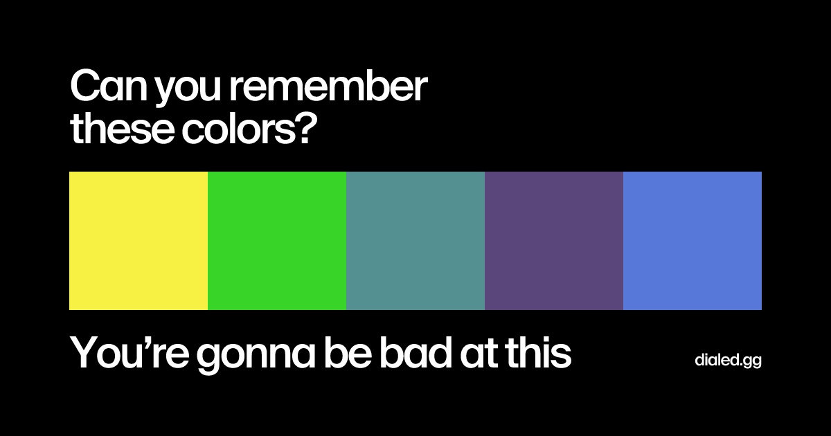 The Color Game. “Humans can’t reliably recall colors. This is a simple game to see how good (or bad) you are at it. We’ll show you five colors, then you’ll try and recreate them.” I scored 39/50 but got a perfect score on one color.