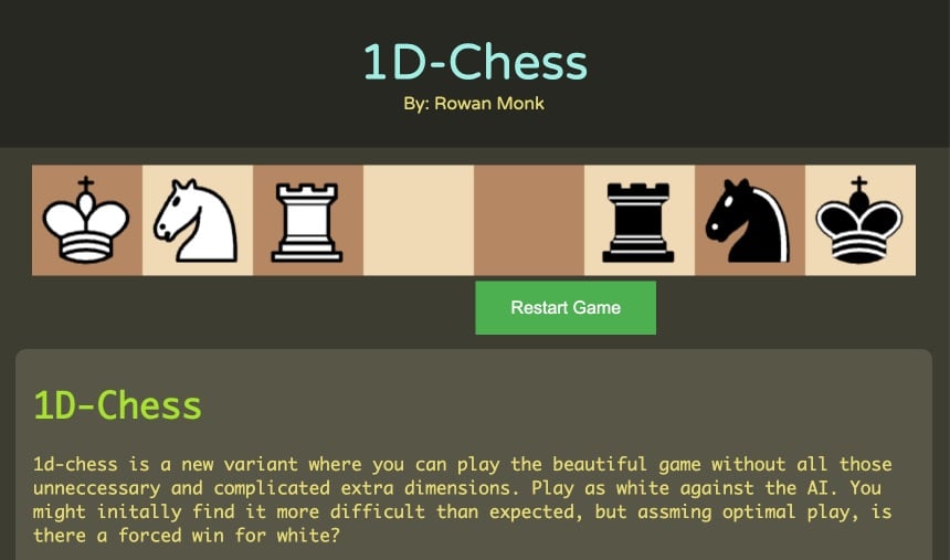 1D Chess. “You might initially find it more difficult than expected, but assuming optimal play, is there a forced win for white?”